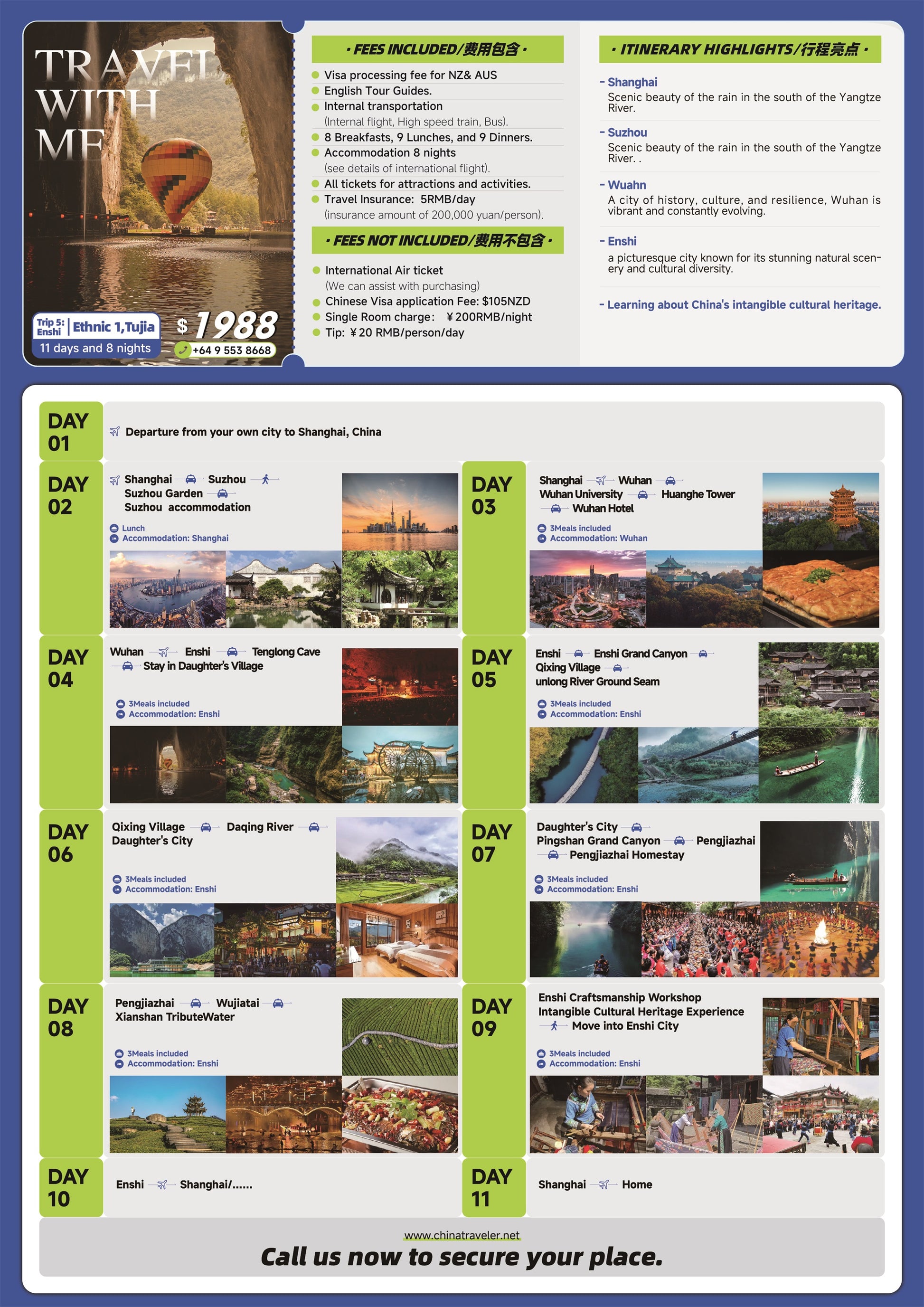 Today's highlights: Qingjiang Mountains and Rivers, the gathering place of Chinese soil and Miao culture, Daughter's City, where you can experience bowl smashing wine in the evening. Depart to Daqing River in the morning, take a boat tour of Butterfly Cliff in Daqing River, return to Enshi City in the afternoon, visit Daughter's City, and experience the experience of throwing bowls of wine.