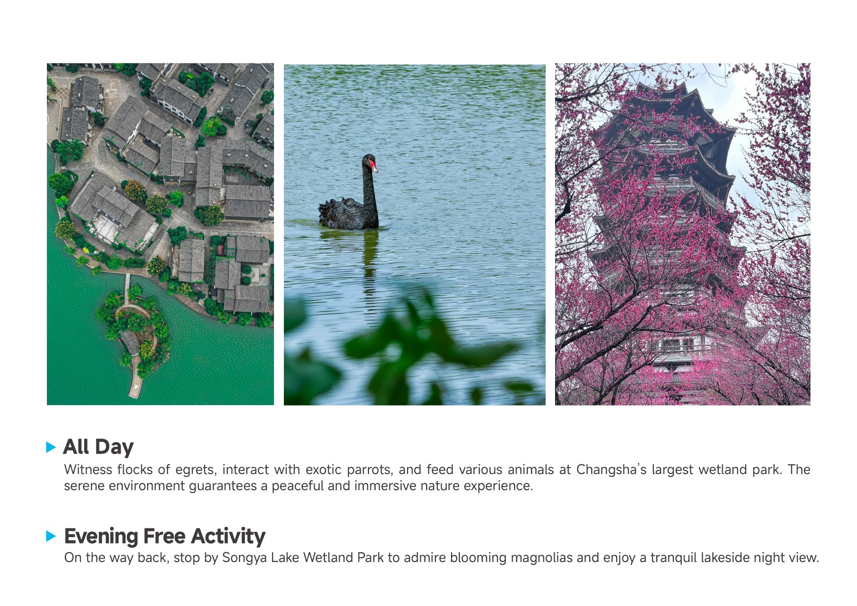 All Day: Witness flocks of egrets, interact with exotic parrots, and feed various animals at Changsha’s largest wetland park. The serene environment guarantees a peaceful and immersive nature experience.