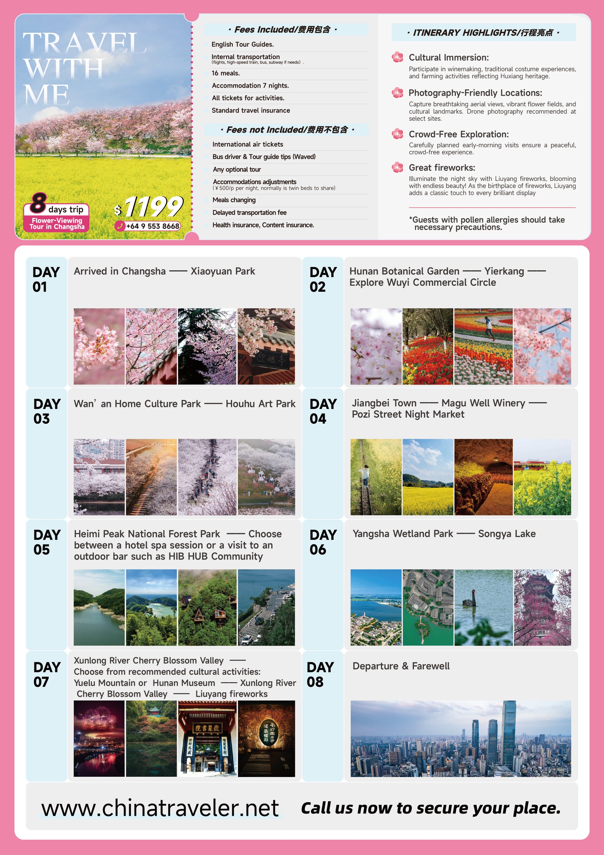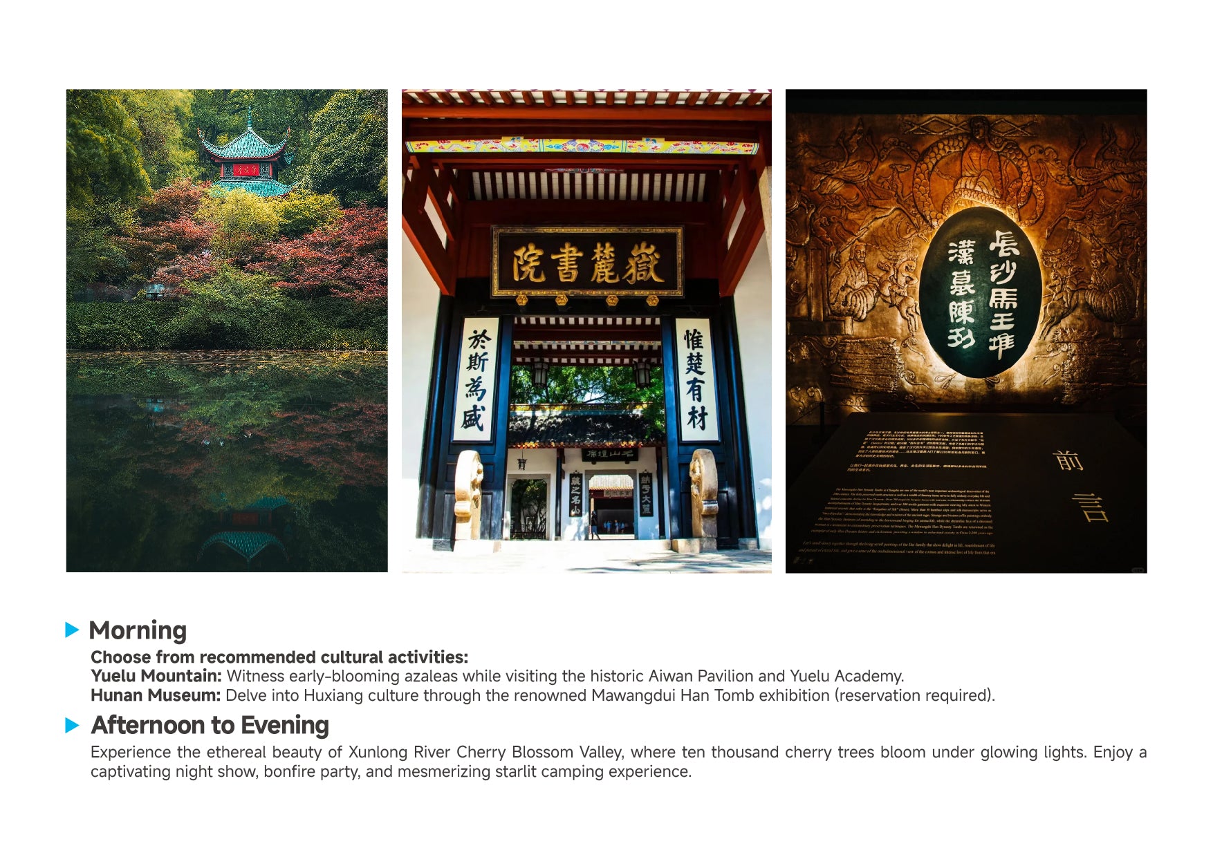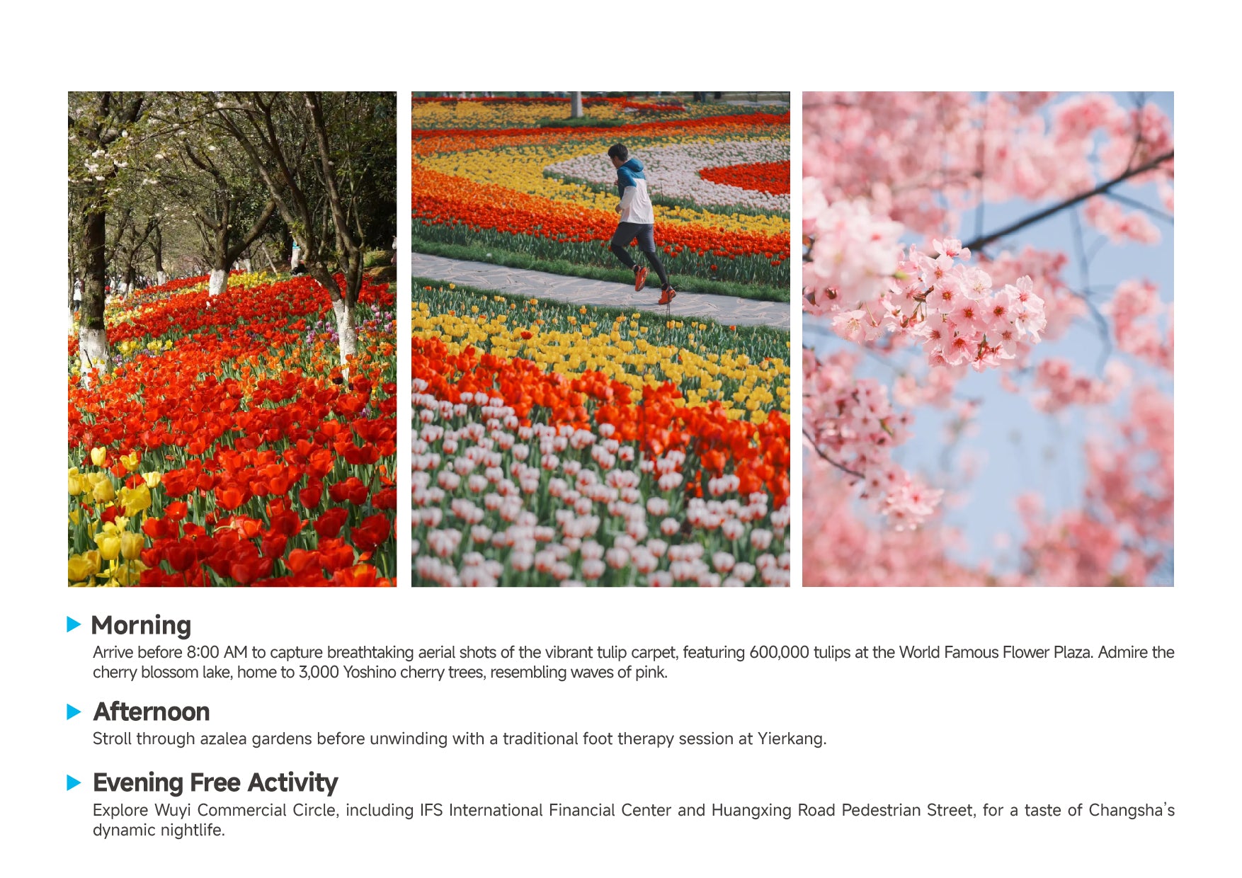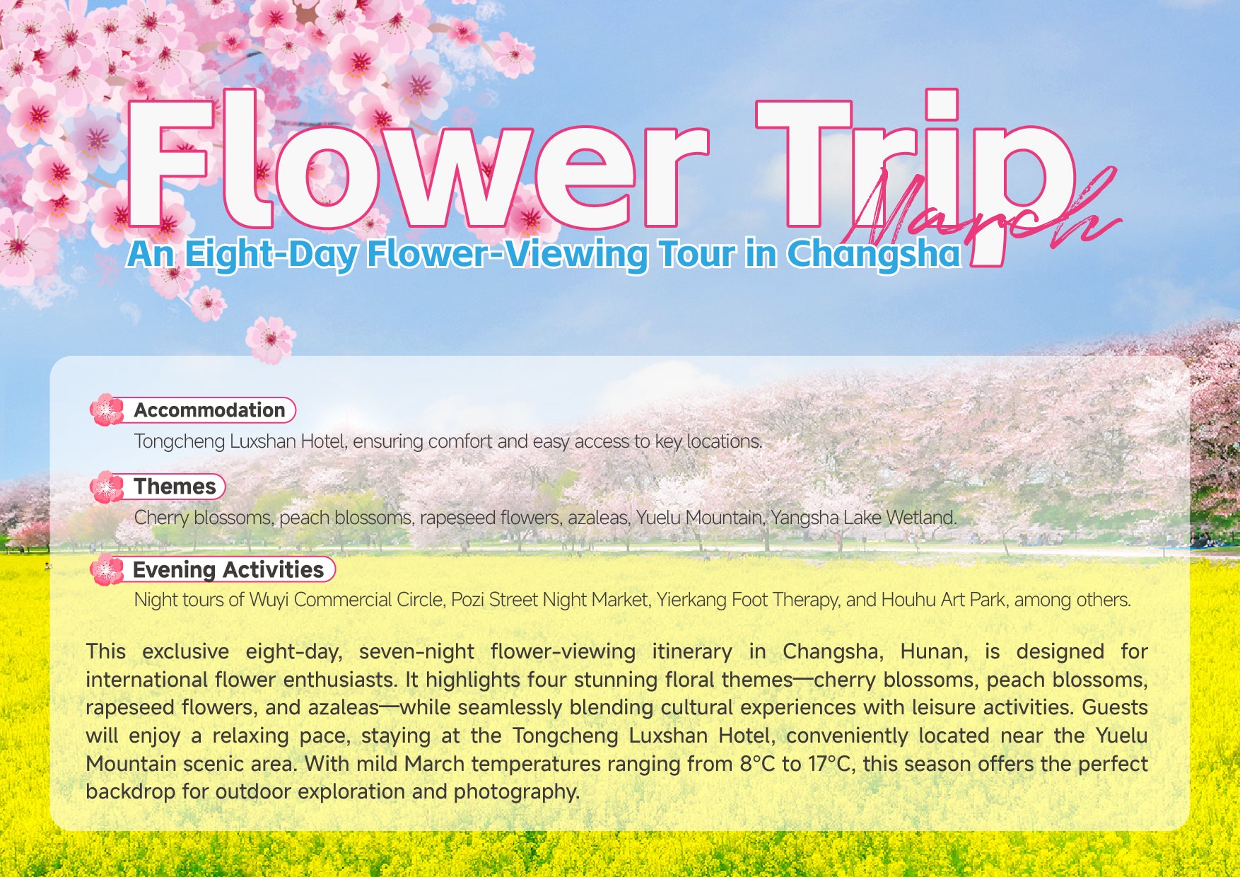 This exclusive eight-day, seven-night flower-viewing itinerary in Changsha, Hunan, is designed for international flower enthusiasts. It highlights four stunning floral themes—cherry blossoms, peach blossoms, rapeseed flowers, and azaleas—while seamlessly blending cultural experiences with leisure activities. Guests will enjoy a relaxing pace, staying at the Tongcheng Luxshan Hotel, conveniently located near the Yuelu Mountain scenic area. With mild March temperatures ranging from 8°C to 17°C, this season offers the perfect backdrop for outdoor exploration and photography.
