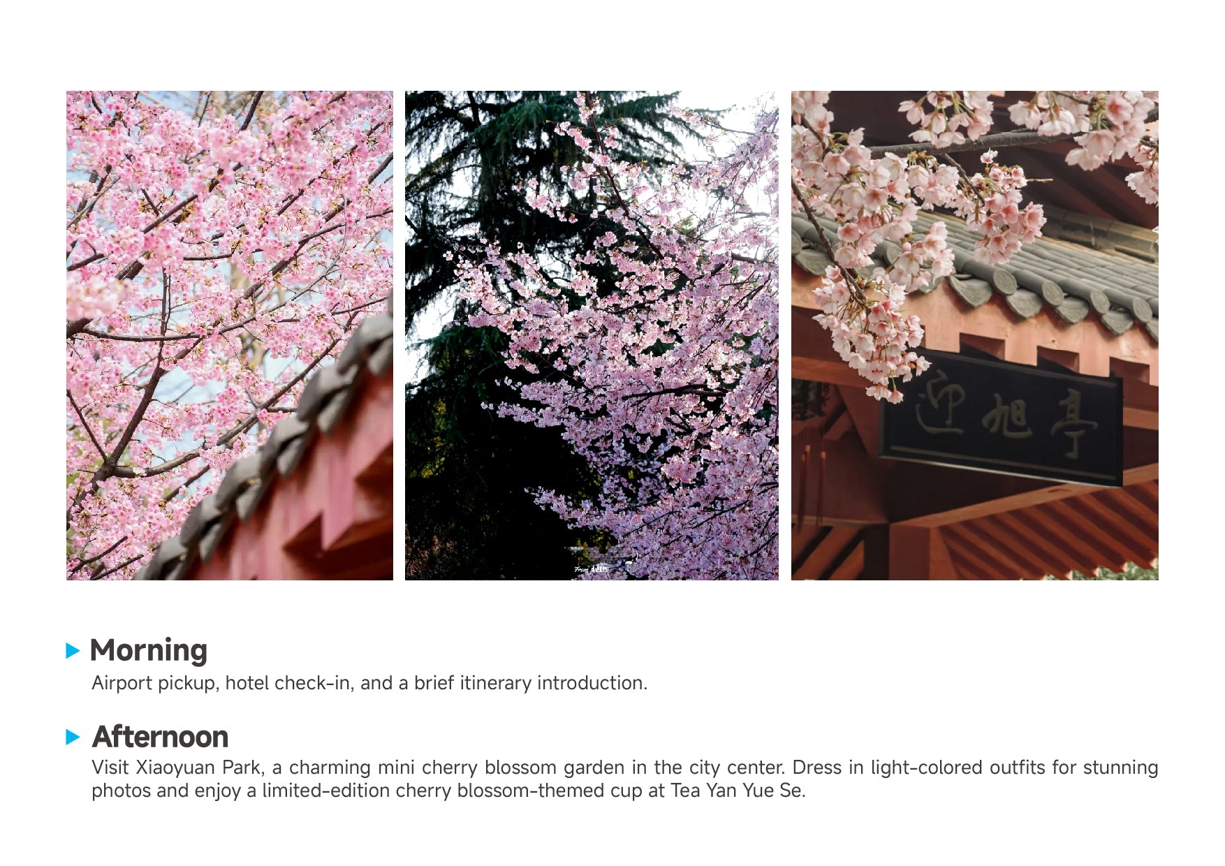 Afternoon: Visit Xiaoyuan Park, a charming mini cherry blossom garden in the city center. Dress in light-colored outfits for stunning photos and enjoy a limited-edition cherry blossom-themed cup at Tea Yan Yue Se.