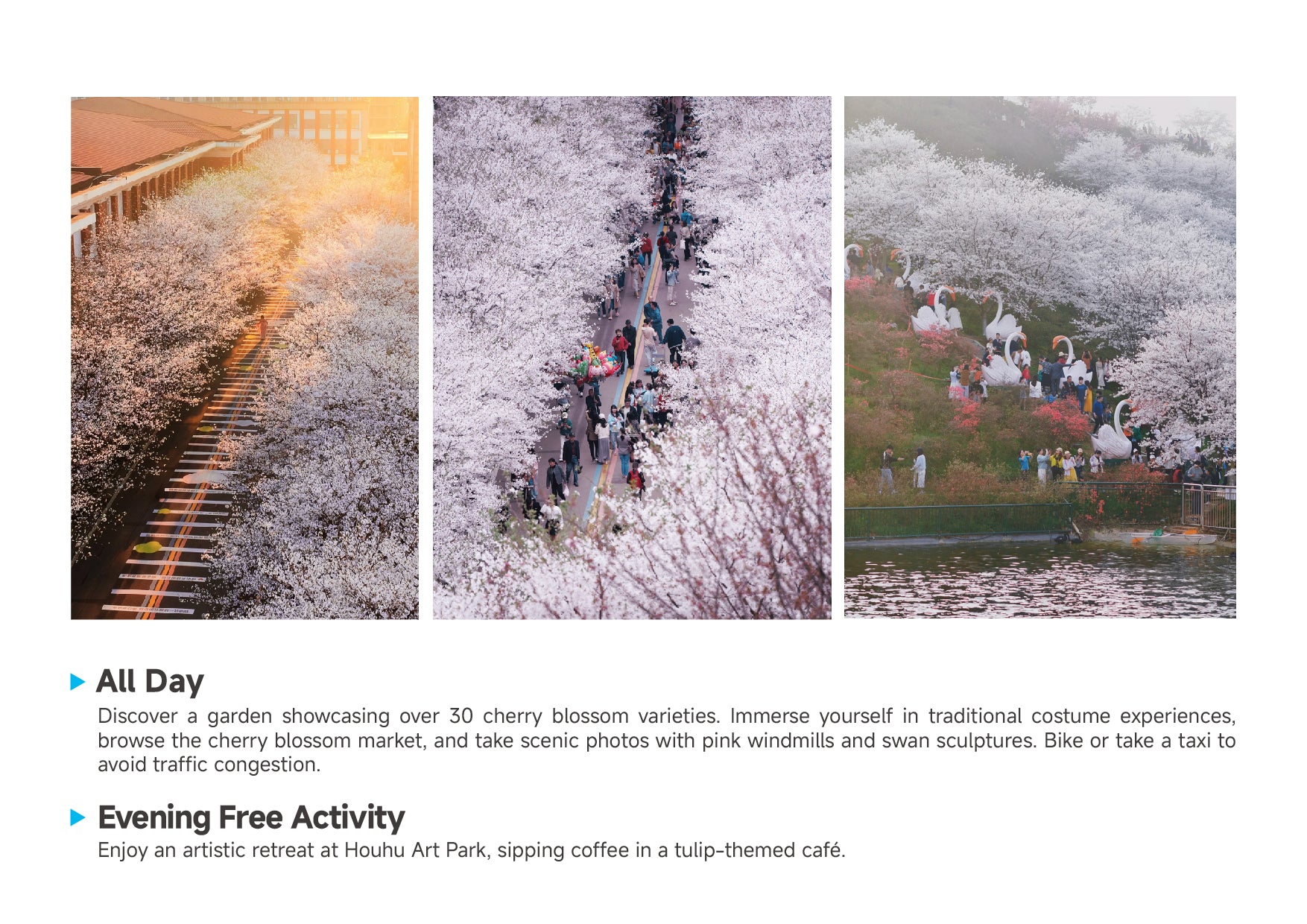 All Day: Discover a garden showcasing over 30 cherry blossom varieties. Immerse yourself in traditional costume experiences, browse the cherry blossom market, and take scenic photos with pink windmills and swan sculptures. Bike or take a taxi to avoid traffic congestion.