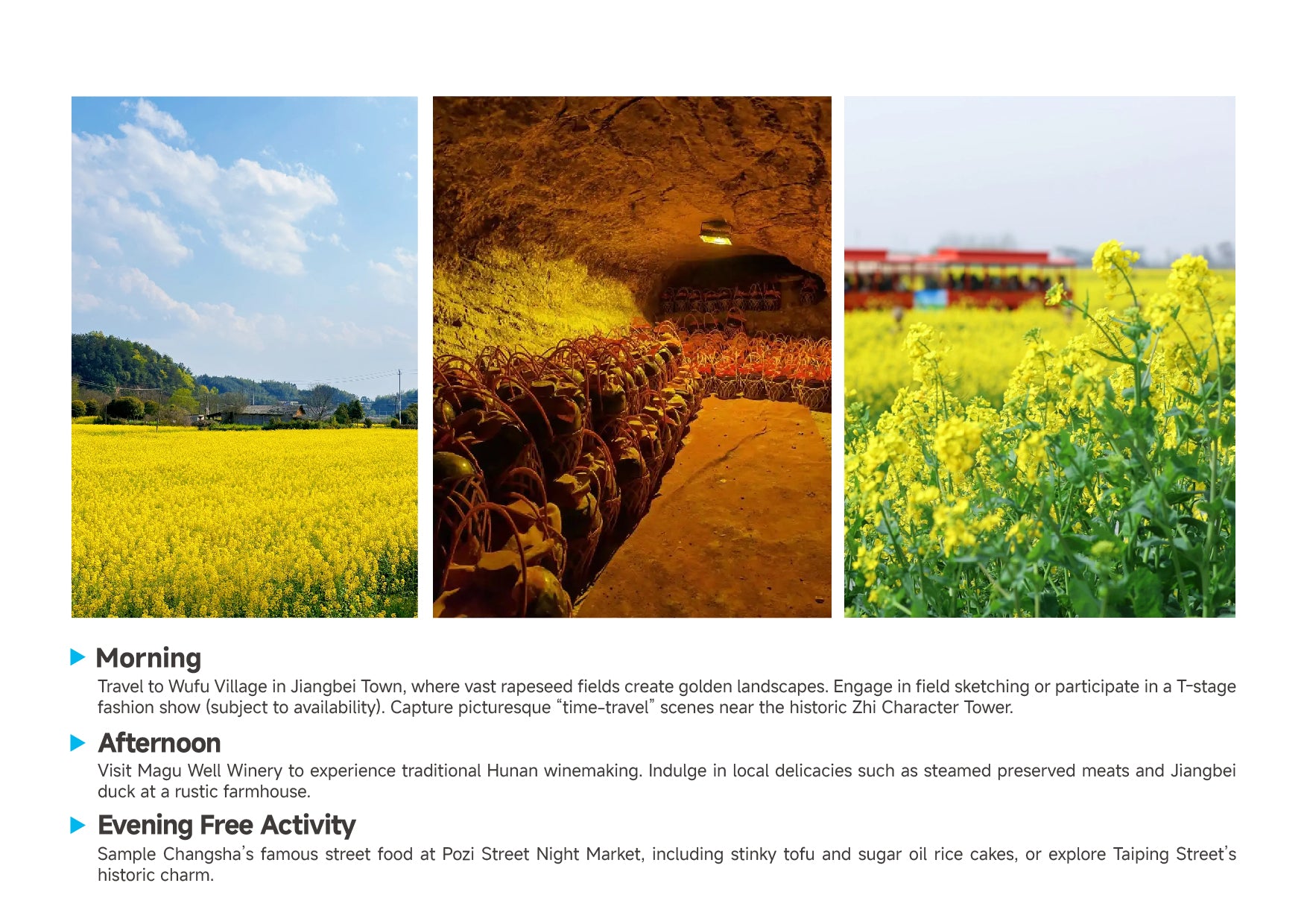 Morning: Travel to Wufu Village in Jiangbei Town, where vast rapeseed fields create golden landscapes. Engage in field sketching or participate in a T-stage fashion show (subject to availability). Capture picturesque “time-travel” scenes near the historic Zhi Character Tower.