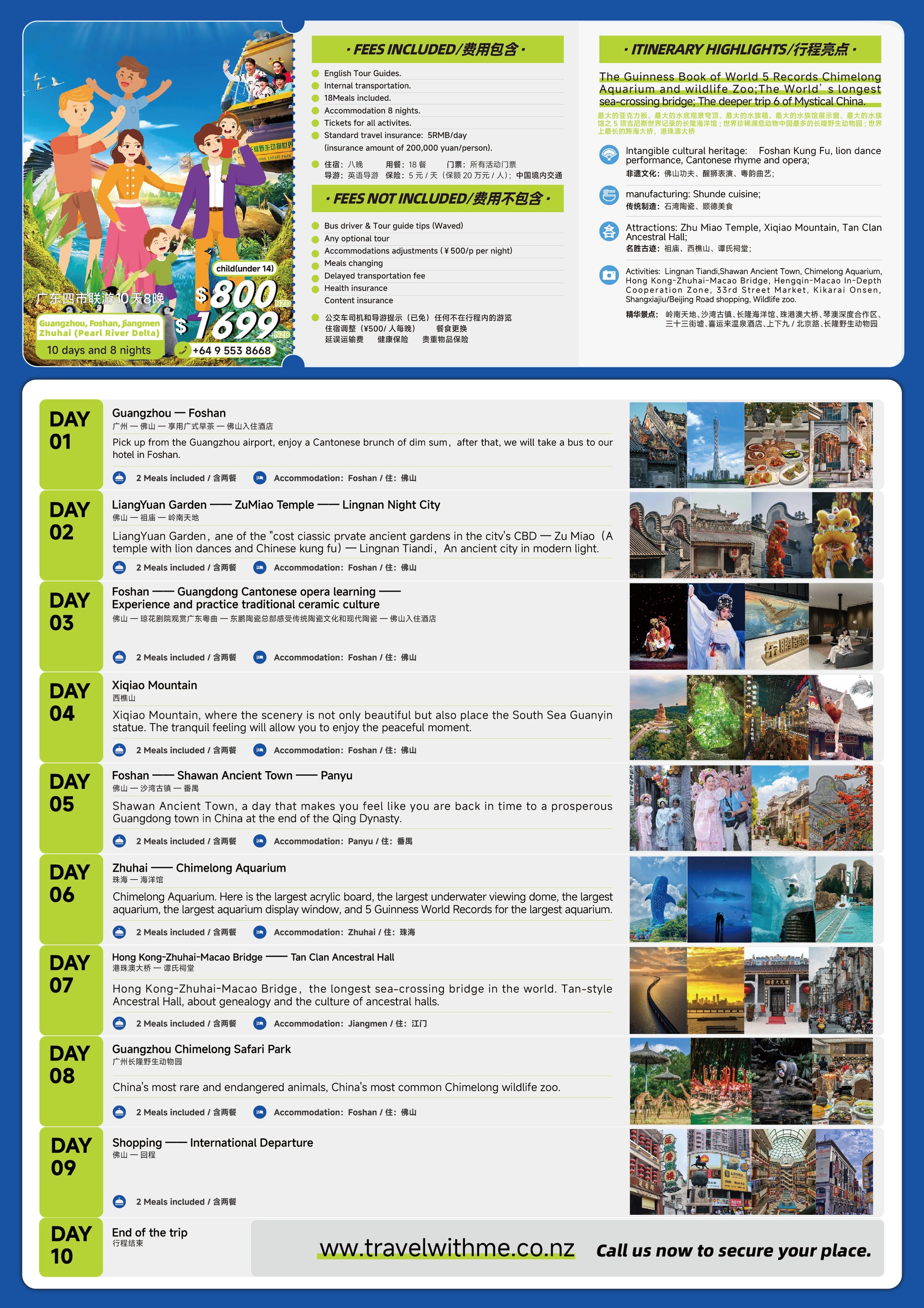 Activities: Guangzhou tower, Guangdong Eternal Live show, Lingnan Tiandi, Bruce Lee's hometown GongFu learning, Fengjian Water Town, Shawan Ancient Town, Chimelong Aquarium, Hong Kong-Zhuhai-Macao Bridge, Hengqin-Macao In-Depth Cooperation Zone, 33rd Street Market, Kikarai Onsen, Shangxiajiu/Beijing Road shopping, Wildlife zoo.