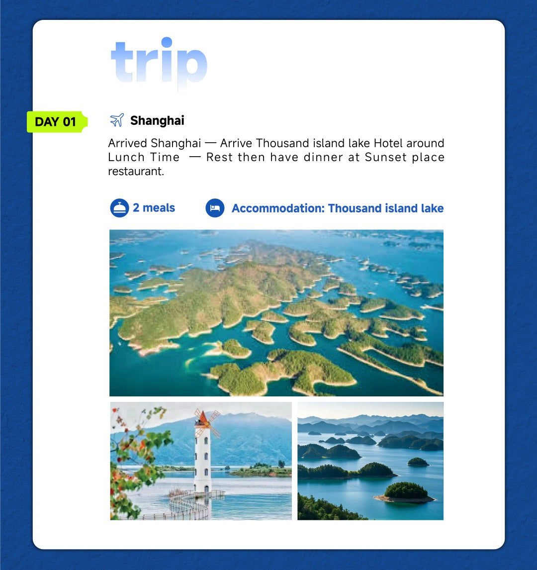 · Arrive in Shanghai and travel for about 2.5 h to Qiandao Lake..