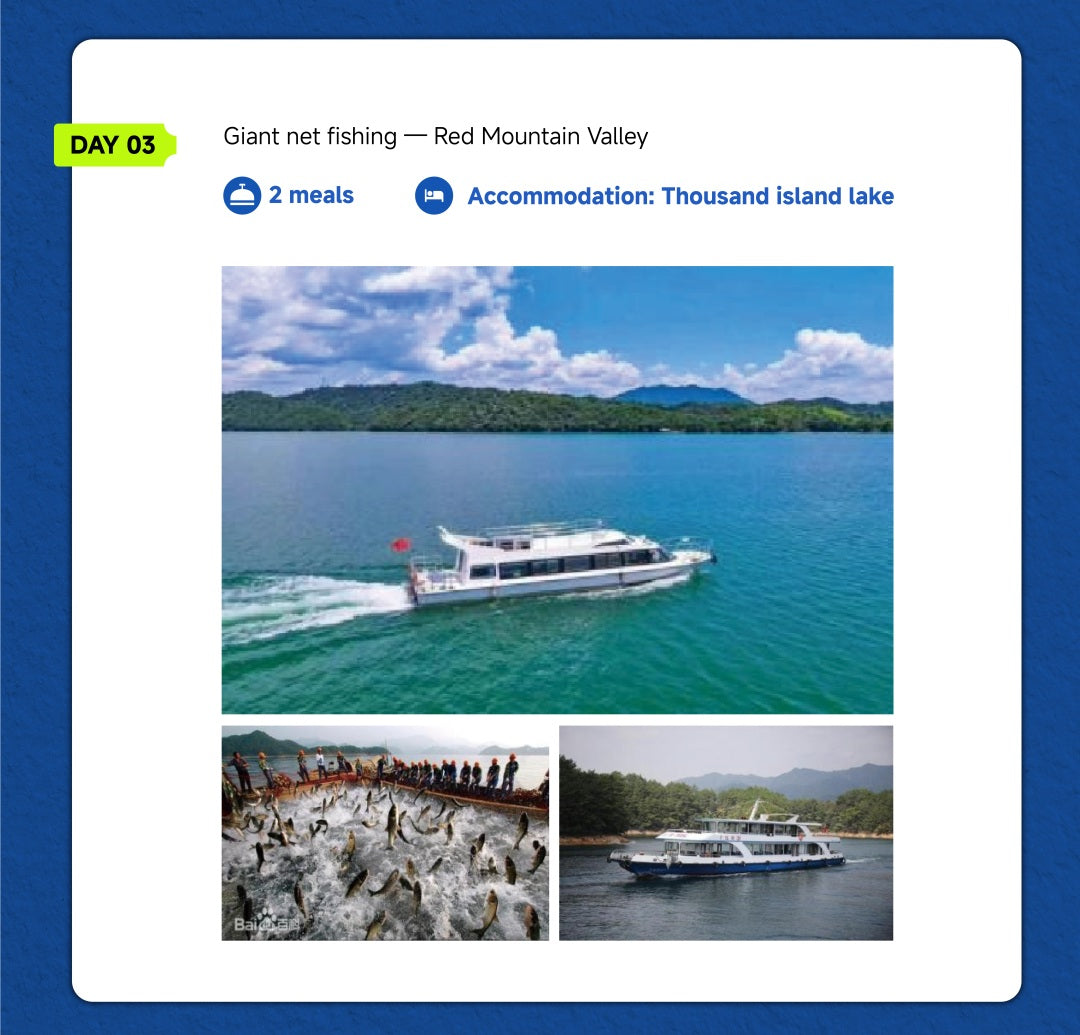 Explore the striking beauty of Qiandao Lake, cruising among over 1,000 islands, trying traditional giant‑net fishing, and hiking through Red Mountain Valley.