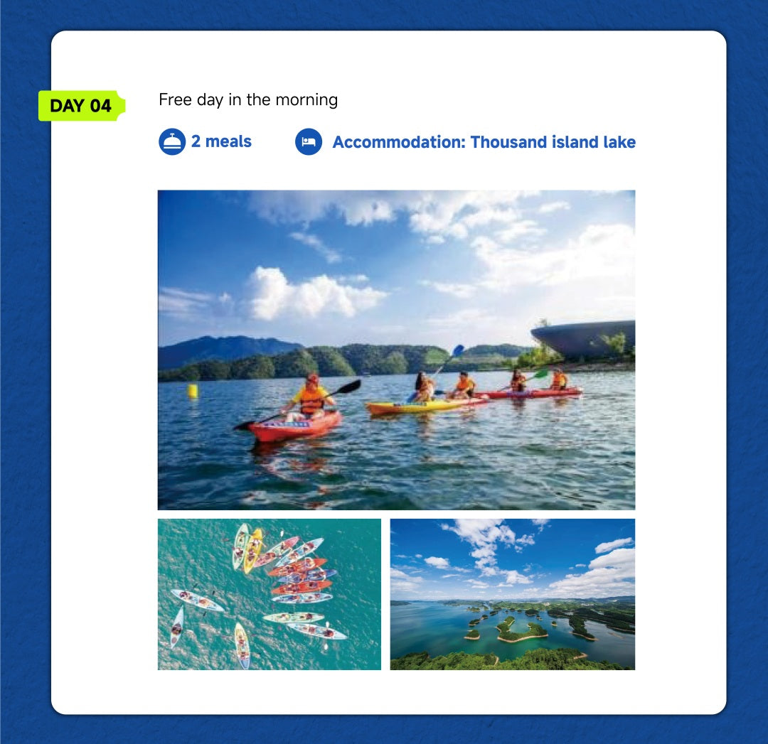 · Enjoy a free morning at Qiandao Lake—options like cycling, tea-picking, or sightseeing.