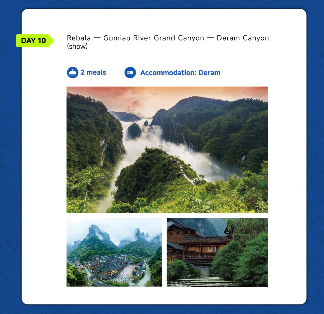 · Arrive and wander through riverside stone streets and stilt houses,experience local cuisine and enjoy an ethnic music or dance show at night.