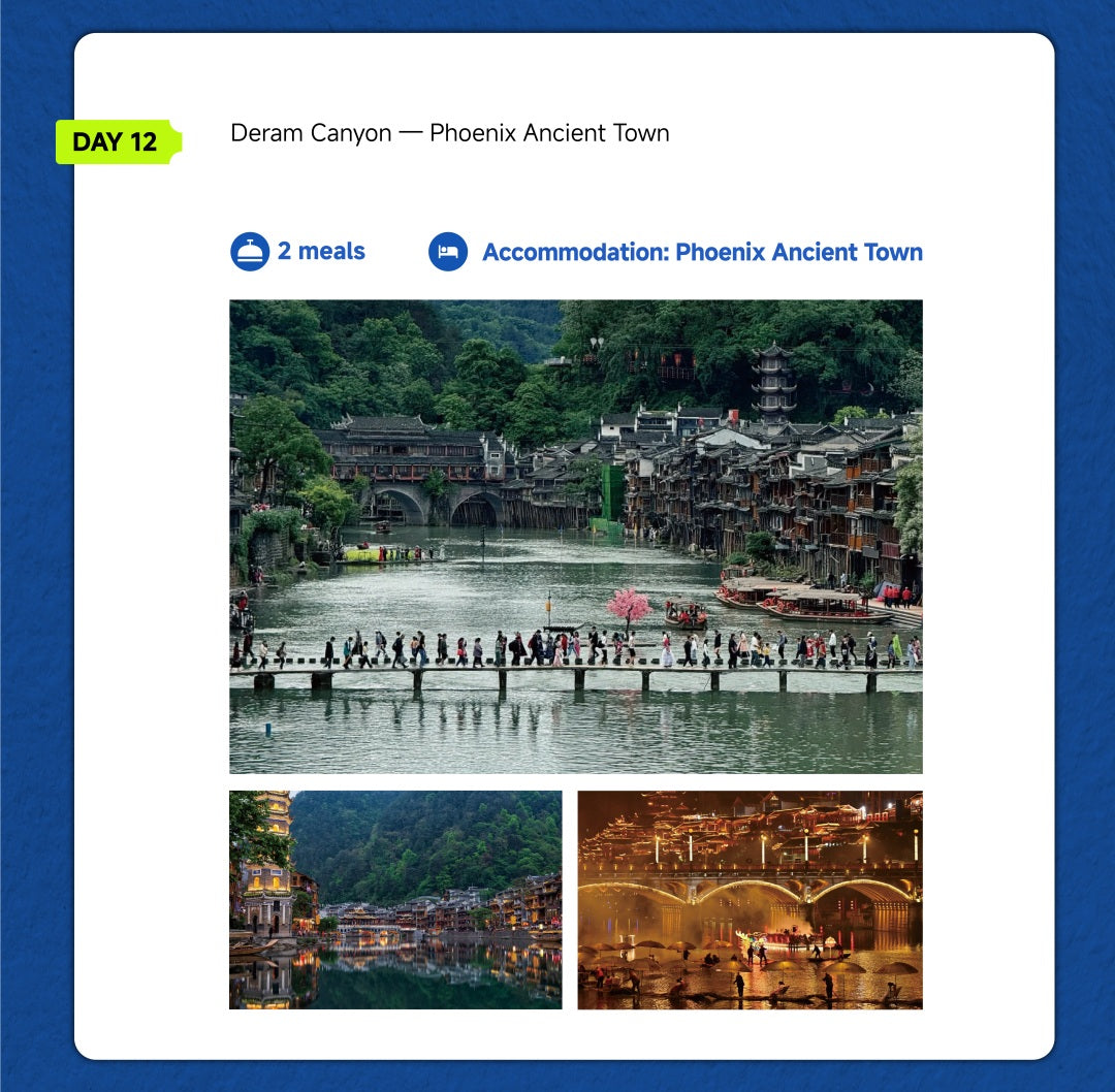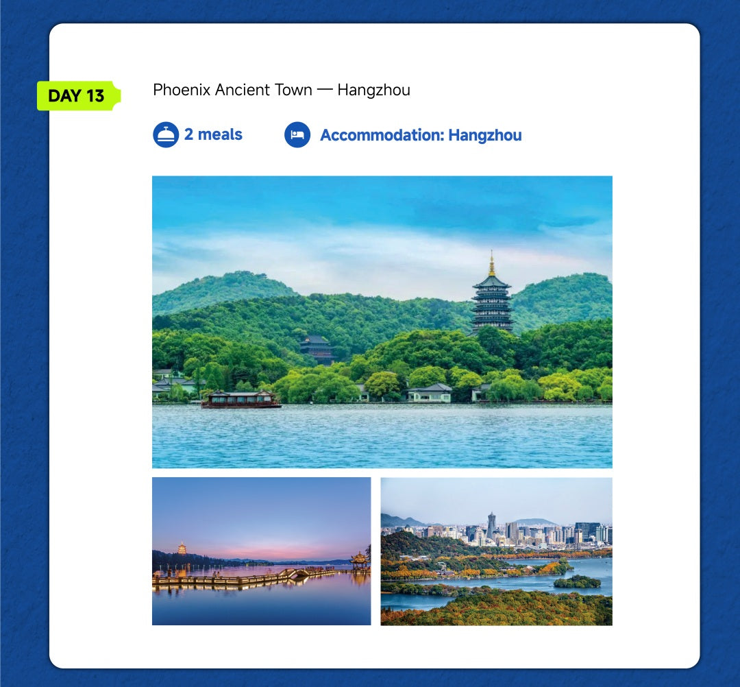Finish in Phoenix Ancient Town and picturesque Hangzhou, savoring riverside charm, historic streets, West Lake scenery, and local cultural highlights..