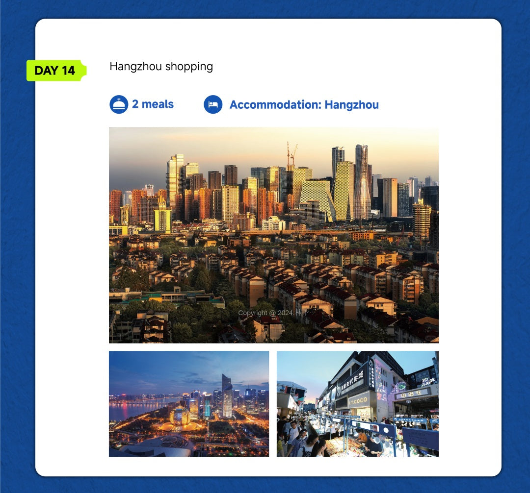 · Spend the day visiting iconic sites: Broken Bridge, Leifeng Pagoda, Su Causeway;Explore Hefang Street and the old town for snacks and souvenirs.