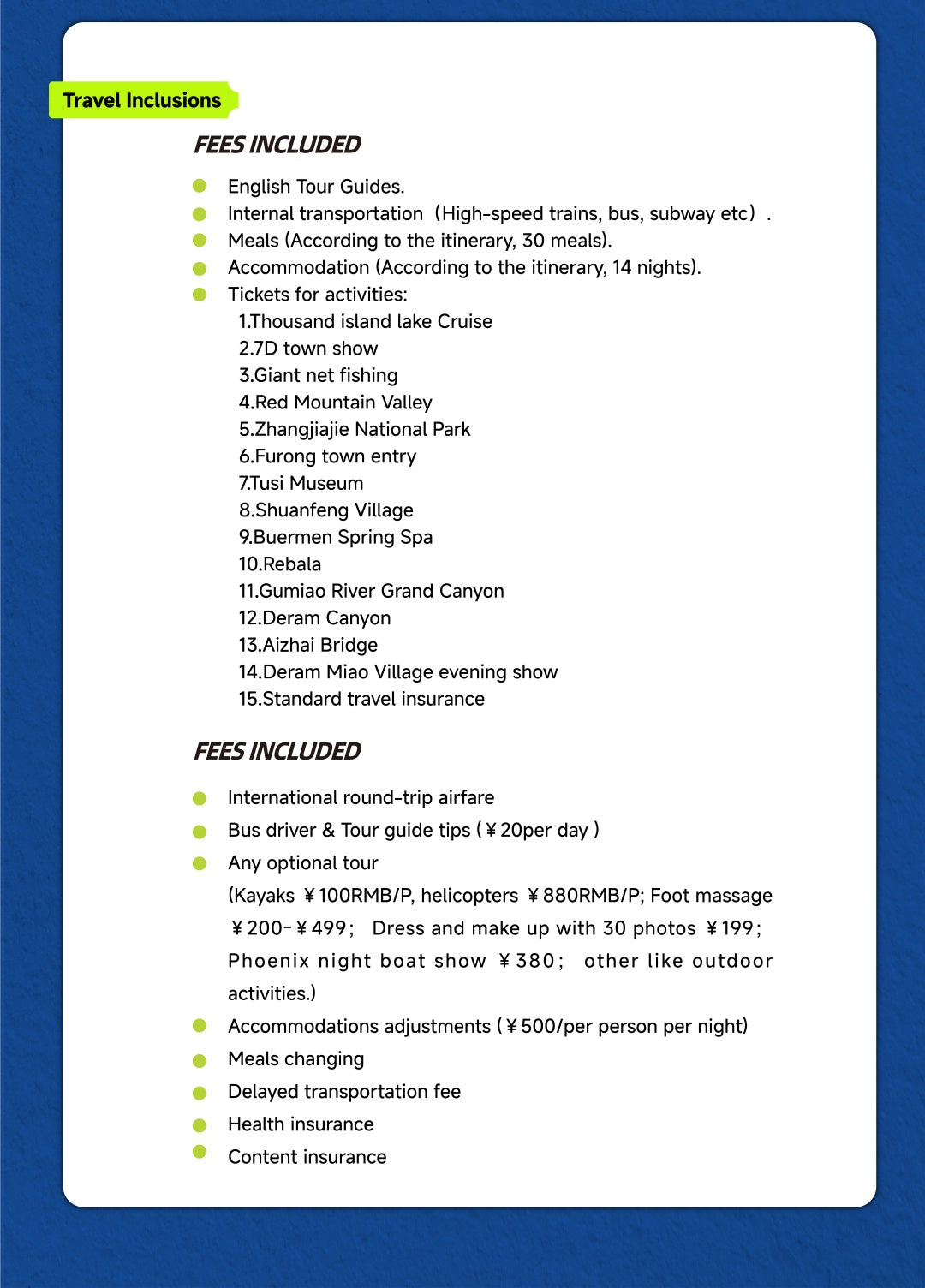 (Kayaks ¥100RMB/P, helicopters ¥880RMB/P; Foot massage ¥200-¥499; Dress and make up with 30 photos ¥199; Phoenix night boat show ¥380; other like outdoor activities.)