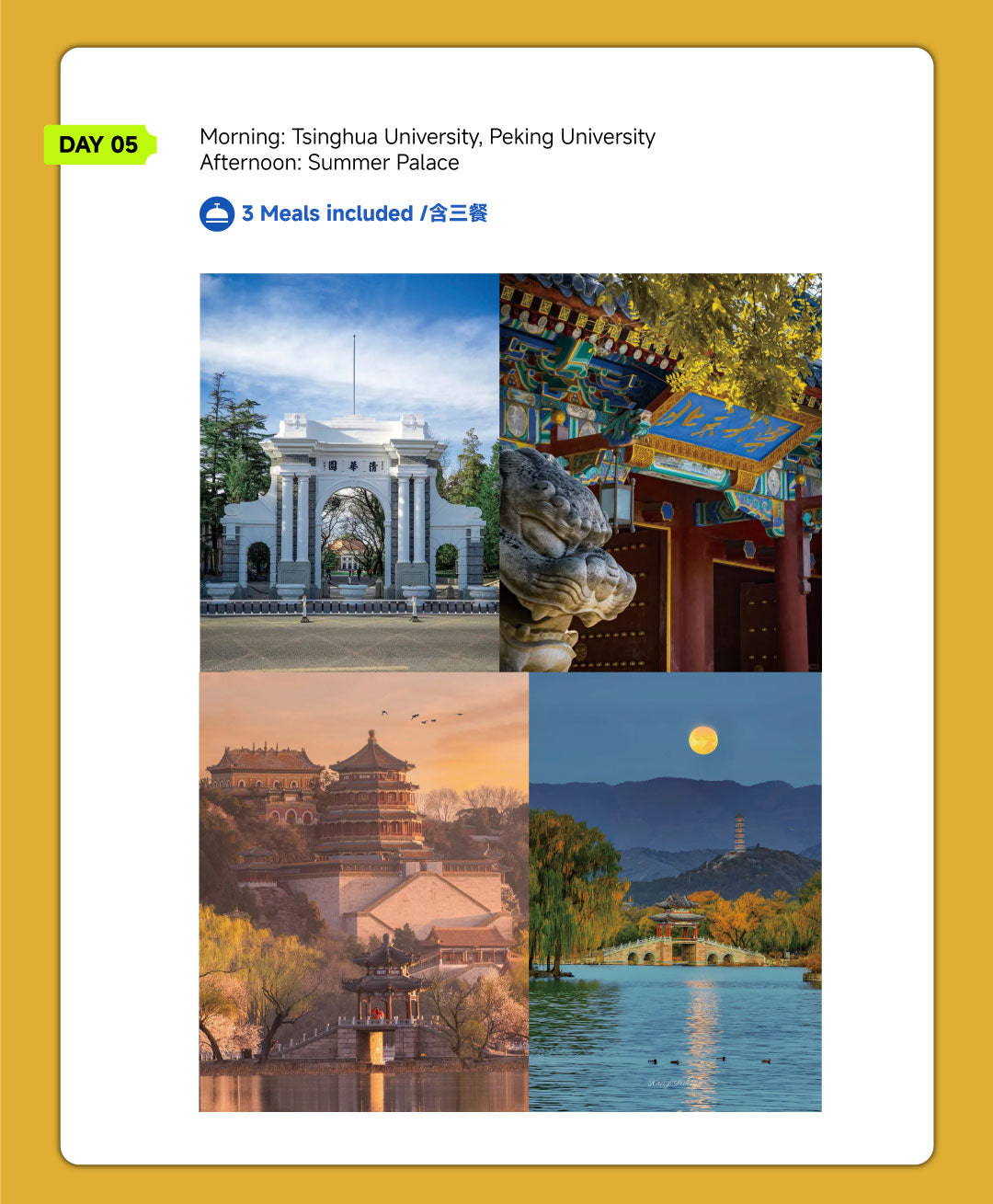 Visit iconic landmarks like the Forbidden City, Temple of Heaven, and Summer Palace, and marvel at the engineering wonder of the Juyongguan Great Wall. Discover traditional hutongs, modern Olympic sites like the Bird’s Nest and Water Cube, and prestigious universities Tsinghua and Peking.